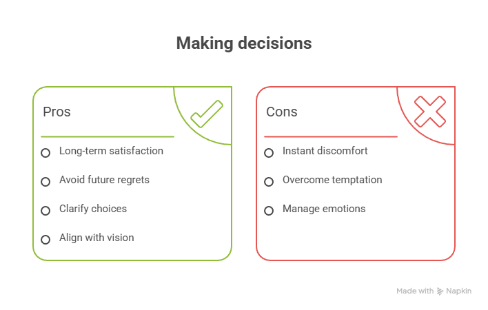 Decisions made solely for instant comfort often become tomorrow’s regrets. To make better long term choices, time travel in your mind. Project yourself into the future – a year, five years, ten years down the road – and imagine looking back at today. Will you be proud of this decision later? What would Future You wish you had done? This perspective can cut through some of the short term noise (emotions, peer pressure, temptation to procrastinate) and clarify the more enduring choice. For example, staying in your comfort zone might feel safe now, but will you kick yourself later for not taking that calculated risk? Align decisions with the vision you have for your life or business in the long haul. Your future self will thank you.